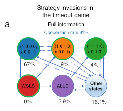 Fig. 2 below reproduces Fig. 3a from their paper, which shows the proportion of time selected strategies are at fixation at the evolutionary steady state. Some nodes in the figure are labelled with a binary string, which is a code that defines that strategy, while WSLS refers to the “win-stay lose-shift” strategy, and ALLD refers to “always defect”.