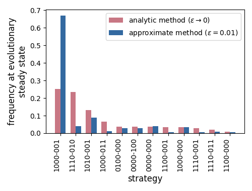 Figure 4. Comparing the evolutionary steady state when the analytic and approximate methods are used. Only the top 12 strategies are shown. Strategies are grouped into payoff-equivalent pairs, where a hyphen indicates that either cooperate or defect can be played.
