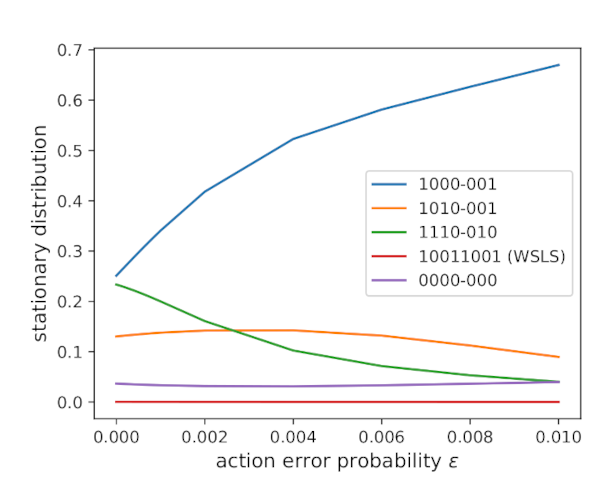 Figure 3. How the proportion of time spent at each strategy in Fig. 2 varies as a function of \(\varepsilon\). Note that the purple line that seems to correspond to ALLD in Fig. 2 is in fact strategy \(\boldsymbol{p} = (0, 0, 0, 0; -, 0, 0, 0)\), where the hyphen refers to a wildcard (can be 0 for defect or 1 for cooperate). ALLD, which has strategy \(\boldsymbol{p} = (0, 0, 0, 0; 0, 0, 0, 0)\), has half the proportion of the purple line shown. I couldn’t figure out the reason for the discrepancy.