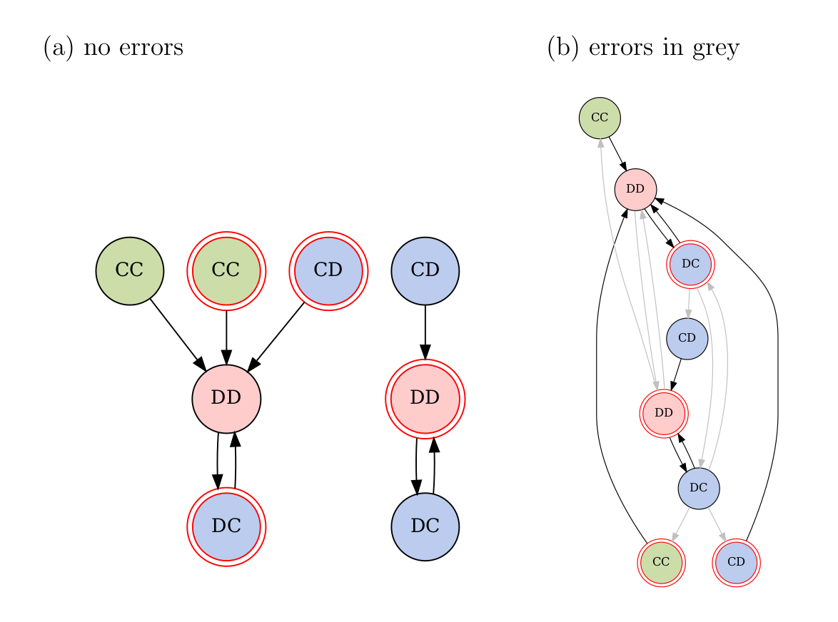 Figure 5. Environment+action state transition graphs for the current example. The environment is indicated by the border: a plain border is a good environment, and a double-ring red border bad. Actions are indicated by the text inside each node, with Player 1’s action first. (a) Transition graph when no action mistakes are made. This Markov chain is not irreducible. (b) Transition graph when errors are permitted, which are shown in grey. This chain is irreducible, and so the stationary distribution can be found. For clarity, only errors that are made in an attractor state are shown.